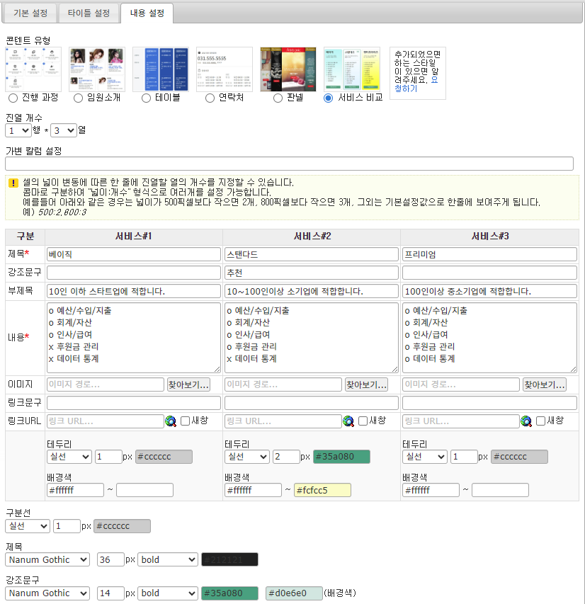 홈페이지빌더 - 잡동사니/페이지꾸미기 모듈에 서비스 비교기능 콘텐트가 추가되었습니다. 오즈웹2026.02.24 14:48:28 조회656 오즈홈빌더에서 잡동사니/페이지꾸미기 모듈 및 웹에디터 위젯중 "콘텐트박스" 위젯에서 아래와 같이 서비스 또는 제품사양을 비교하는 콘텐트를 쉽게 구성할 수 있는 기능이 추가되었습니다.